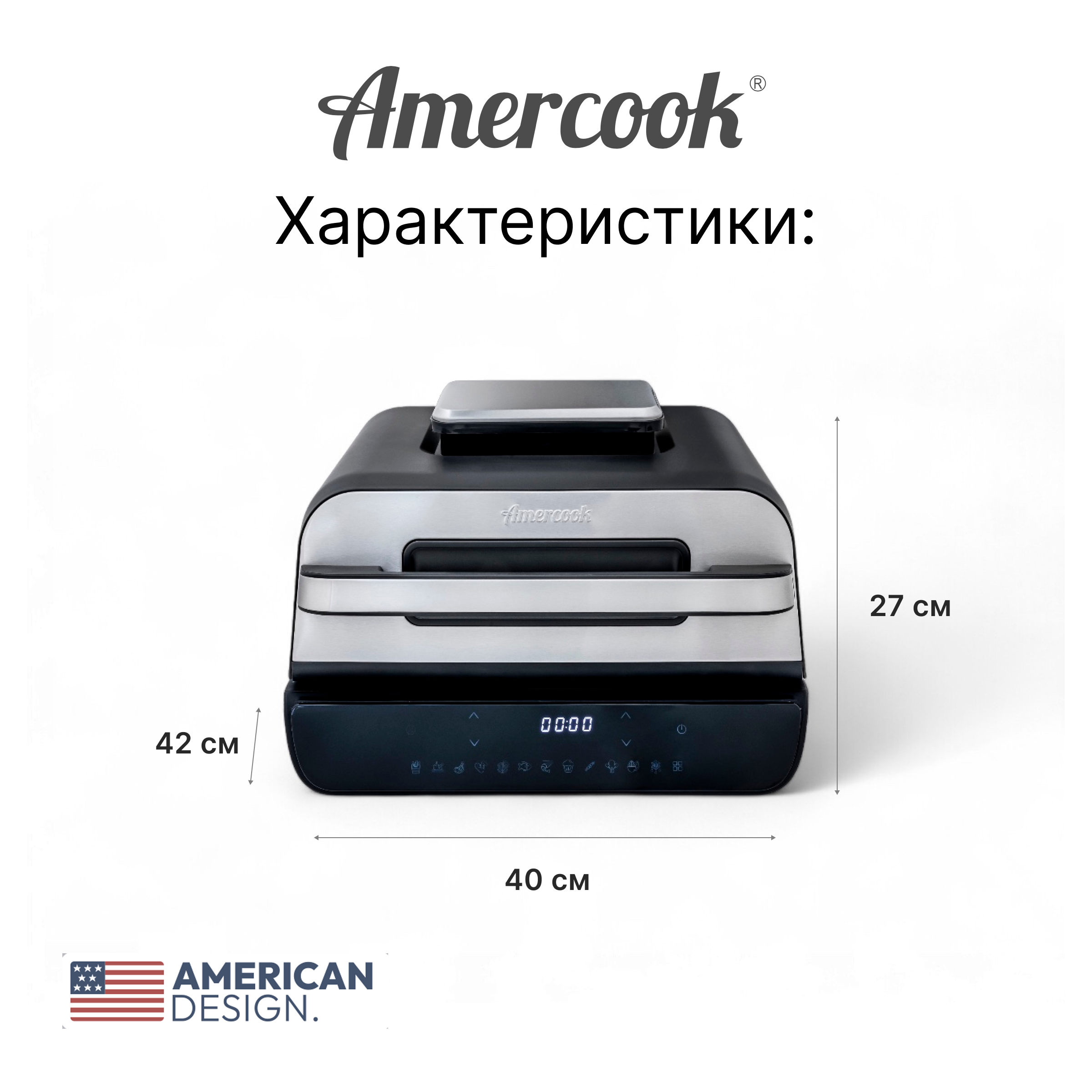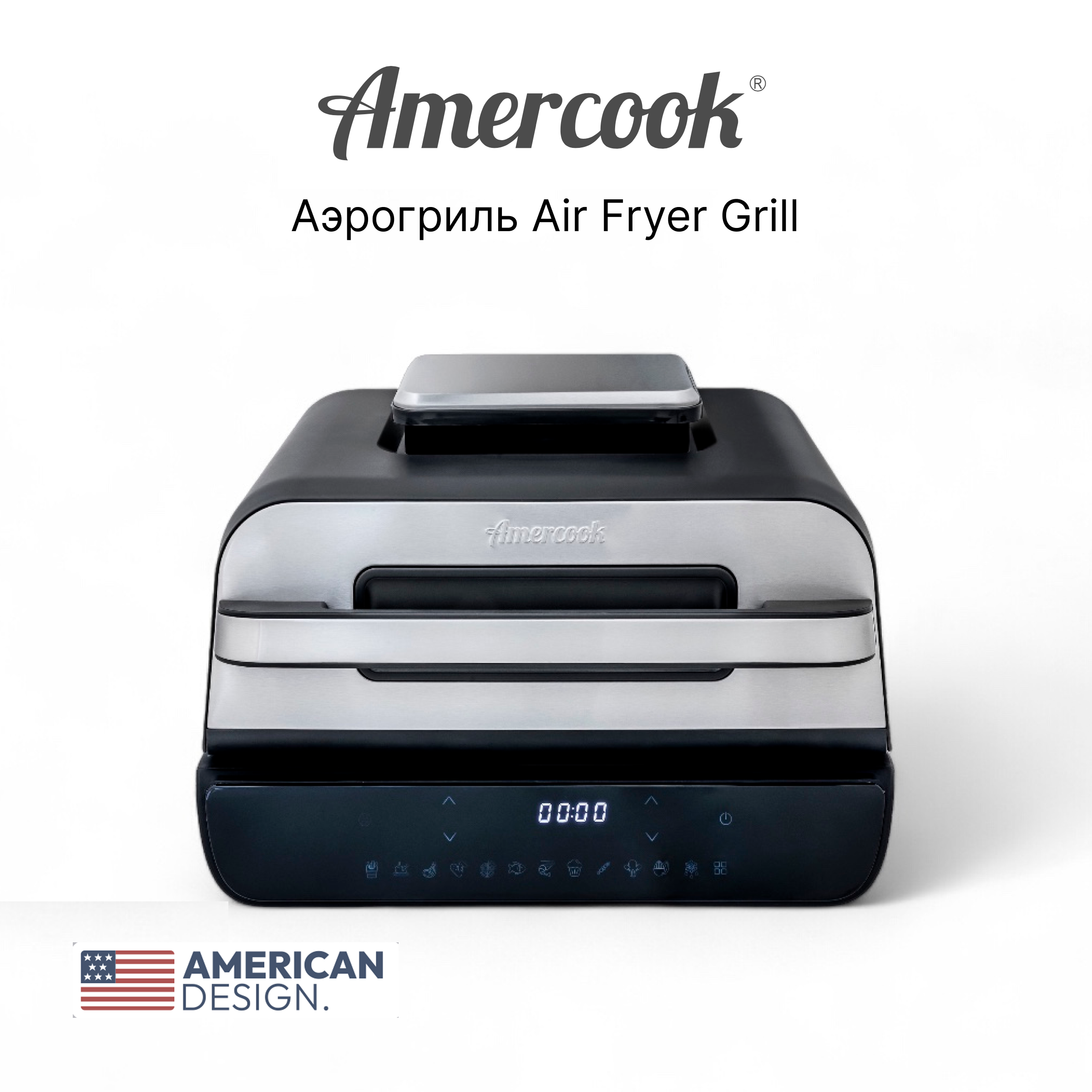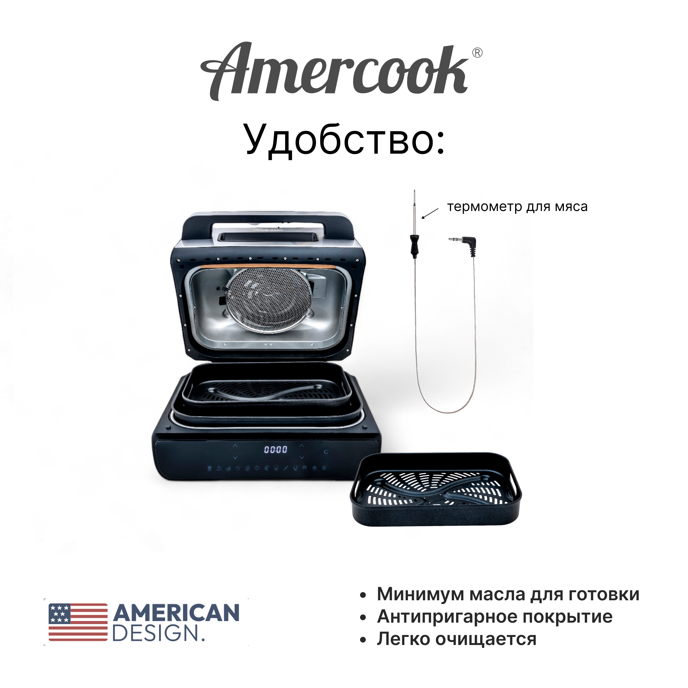 Аэрогриль Air Fryer Grill — это многофункциональный кухонный прибор, использующий горячий воздух для приготовления пищи. Представляет собой комбинацию конвекционной печи и гриля, удобно готовить разнообразные блюда с хрустящей корочкой c минимальным количеством масла. Аэрогриль Amercook оснащен сенсорной панелью управления с возможностью регулировки температуры, времени приготовления и выбора предустановленных программ.