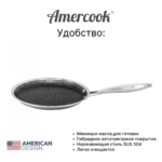 В блинной сковороде Amercook Aristo Pro Series применено гибридное антипригарное покрытие — это сочетание свойств нержавеющей стали и антипригарного покрытия. Гибридное покрытие устойчиво к воздействию пищевых кислот, а значит не портит вкус и качество блюд. Гибридное антипригарное покрытие с рельефным рисунком обеспечивает улучшенные антипригарные свойства и повышенную износостойкость.