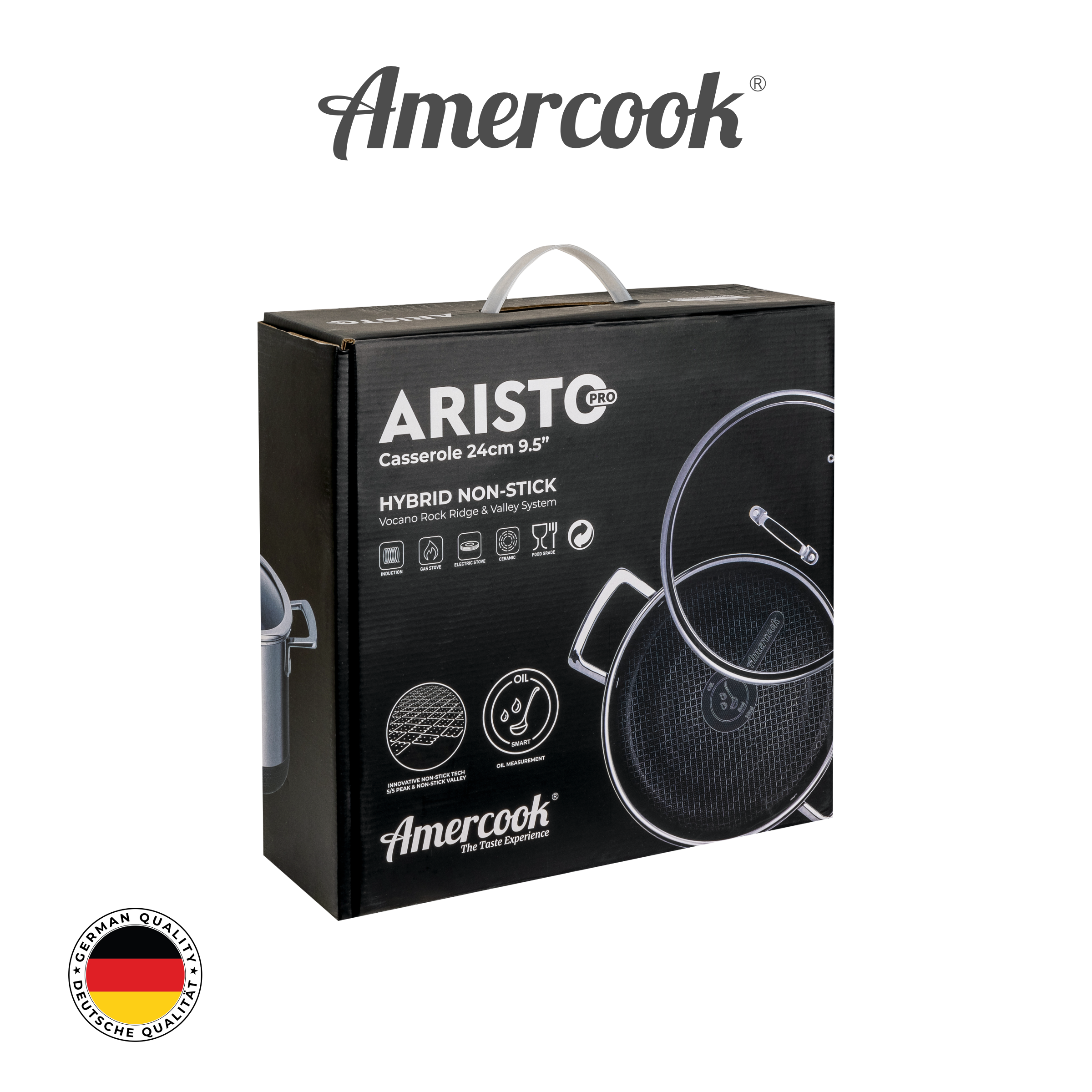 В кастрюле Amercook Aristo Pro Series применено гибридное антипригарное покрытие — это сочетание свойств нержавеющей стали и антипригарного покрытия. Гибридное покрытие устойчиво к воздействию пищевых кислот, а значит не портит вкус и качество блюд. Гибридное антипригарное покрытие с рельефным рисунком обеспечивает улучшенные антипригарные свойства и повышенную износостойкость.