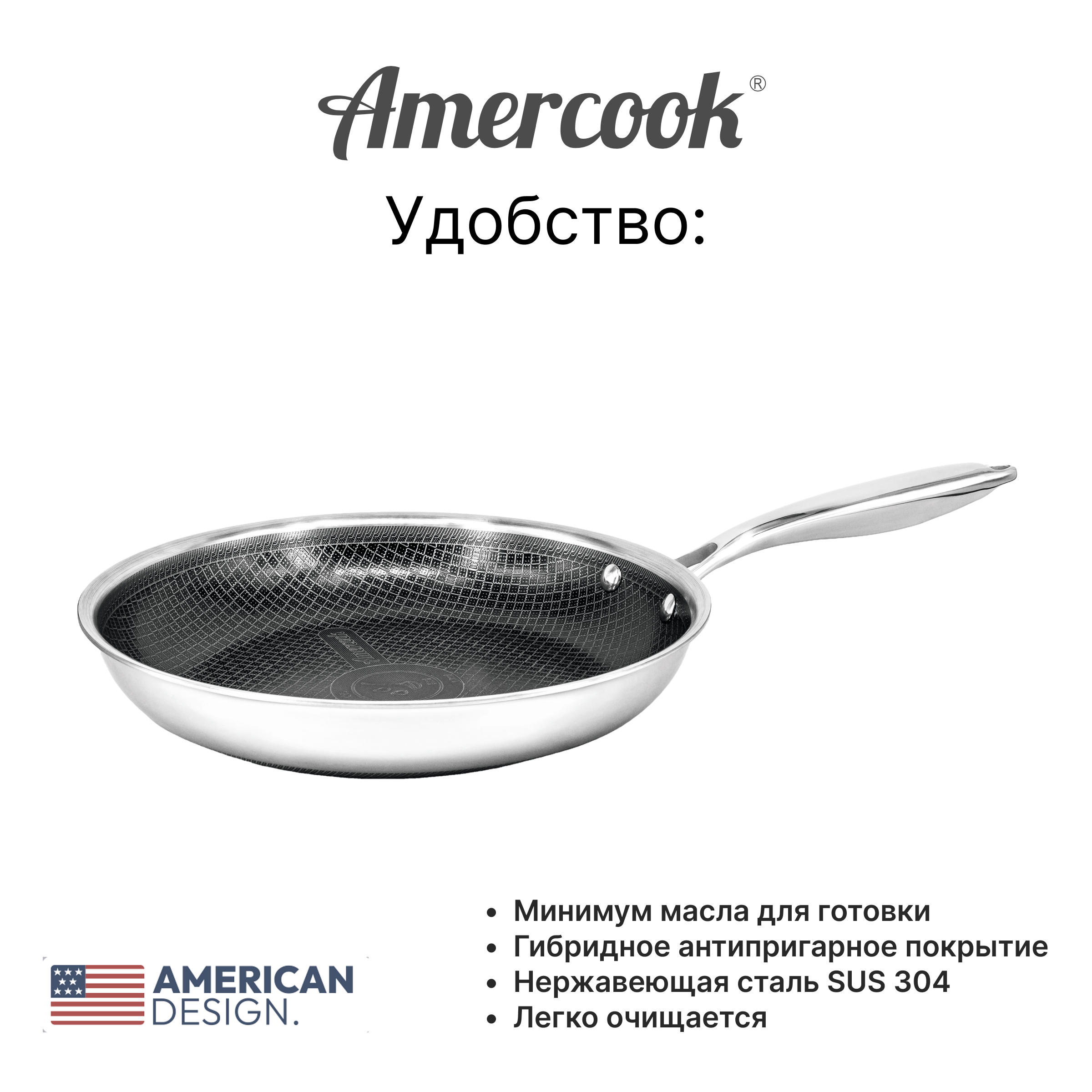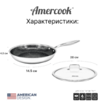 В сковороде Amercook Aristo Pro Series применено гибридное антипригарное покрытие — это сочетание свойств нержавеющей стали и антипригарного покрытия. Гибридное покрытие устойчиво к воздействию пищевых кислот, а значит не портит вкус и качество блюд. Гибридное антипригарное покрытие с рельефным рисунком обеспечивает улучшенные антипригарные свойства и повышенную износостойкость.