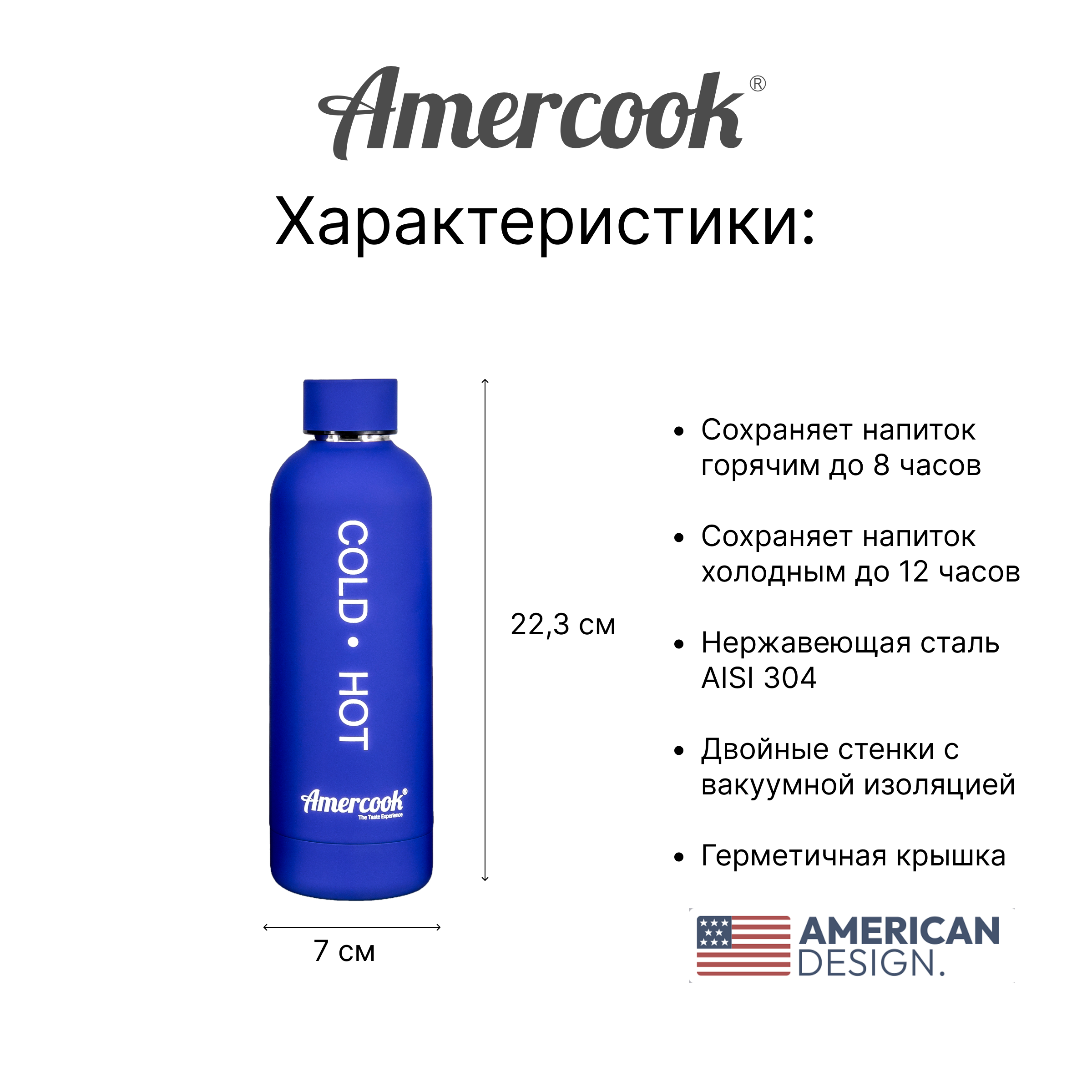 Термо бутылка Amercook – это практичный и стильный аксессуар, который поможет вам наслаждаться любимыми напитками в любое время и в любом месте.