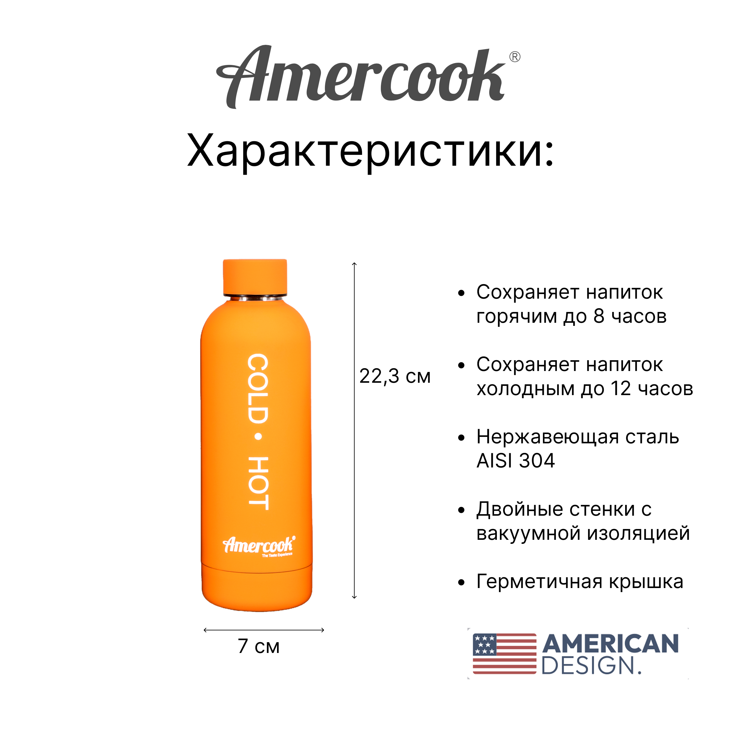 Термо бутылка Amercook – это практичный и стильный аксессуар, который поможет вам наслаждаться любимыми напитками в любое время и в любом месте.